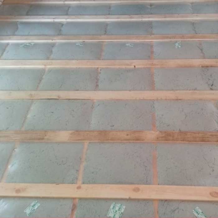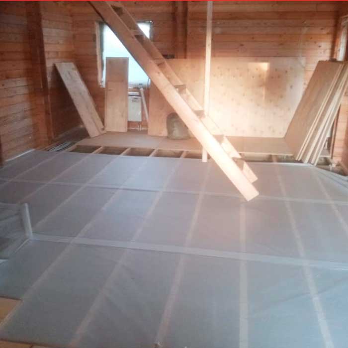 Перед монтажом утеплителя полы нужно закрыть сверху. Это создаст полости, куда можно плотно задуть эковату. Для этого на лаги монтируется гидроизоляция + обрешетка (или черновой пол).