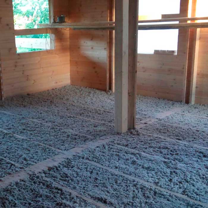 Происходит заполнение каждой отдельной полости пола с помощью шланга или специальной насадки. Плотность задувки в этом случае составляет 50-55 кг/м3, хотя при необходимости технически возможно обеспечить и плотность 55-65 кг/м3, как в стенах.
