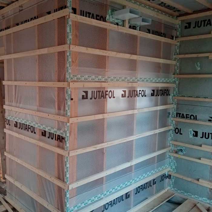 С внутренней стороны каркаса монтируется пароограничительная мембрана, которая проклеивается строительным скотчем Delta Multiband. Монтируется горизонтальная обрешетка из строганого бруска 40х40 мм с шагом 30-40 см для удерживания мембраны.