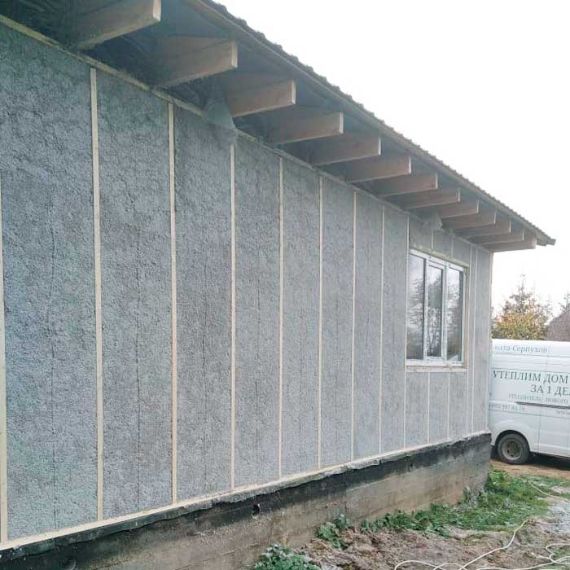 • При нанесении на фасад нужно учитывать погодные условия. Не получится выполнить работы в дождь или сильный ветер. Также необходимо быть готовым к тому, что часть ваты разлетится по участку, что может быть нежелательно или неприемлемо. В таких случаях лучше выбирать сухой монтаж или возводить вокруг дома защитные конструкции, что связано с дополнительными затратами.